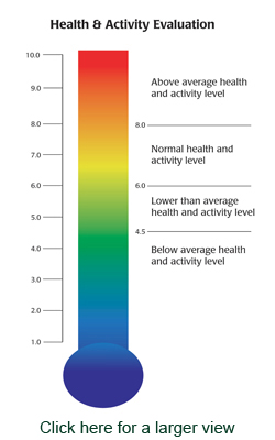 As we get older our health and activity number will decrease and will be approximately 4 or less when we die. Fit adolescents may have a health and activity number greater than 10. This effect is a result of cell integrity due to age. Low health and activity numbers are consistent with: